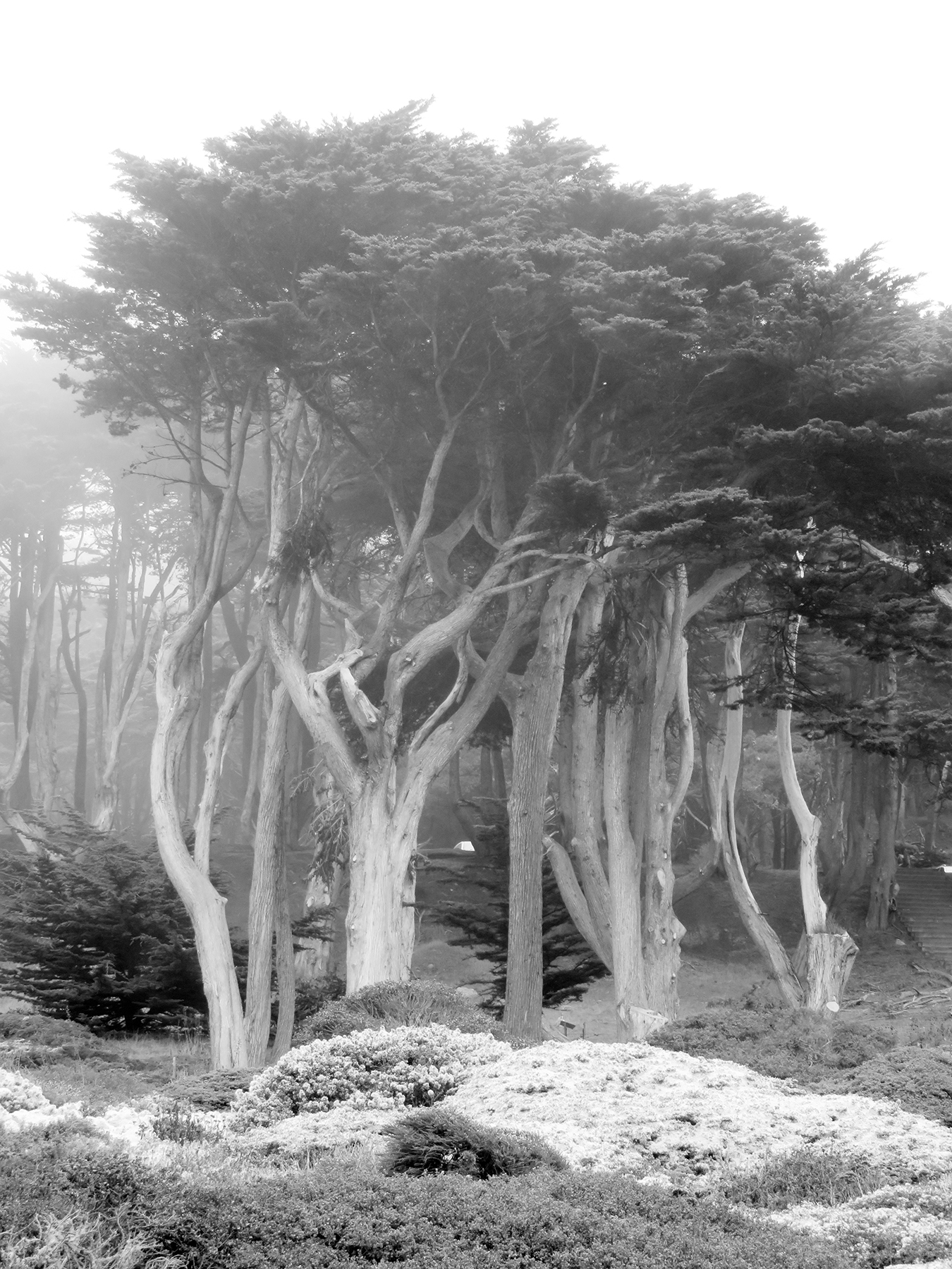 (My photographs today are of unclimbed but admired trees, pines and eucalyptus, in San Francisco’s Golden Gate Park and along the Pacific coast.)
