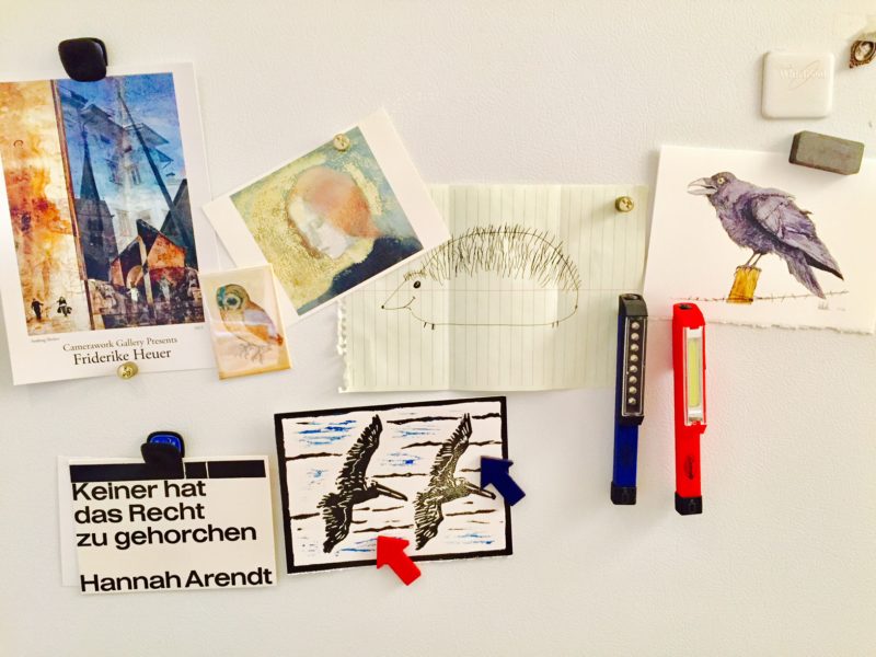 We start with my refrigerator. It brings me joy since I can almost always find some overlooked chocolate pudding in it when in dire need. But it als provides the surface for a changing gallery of pictures that I like, that are meaningful, or things that I need to be reminded of.