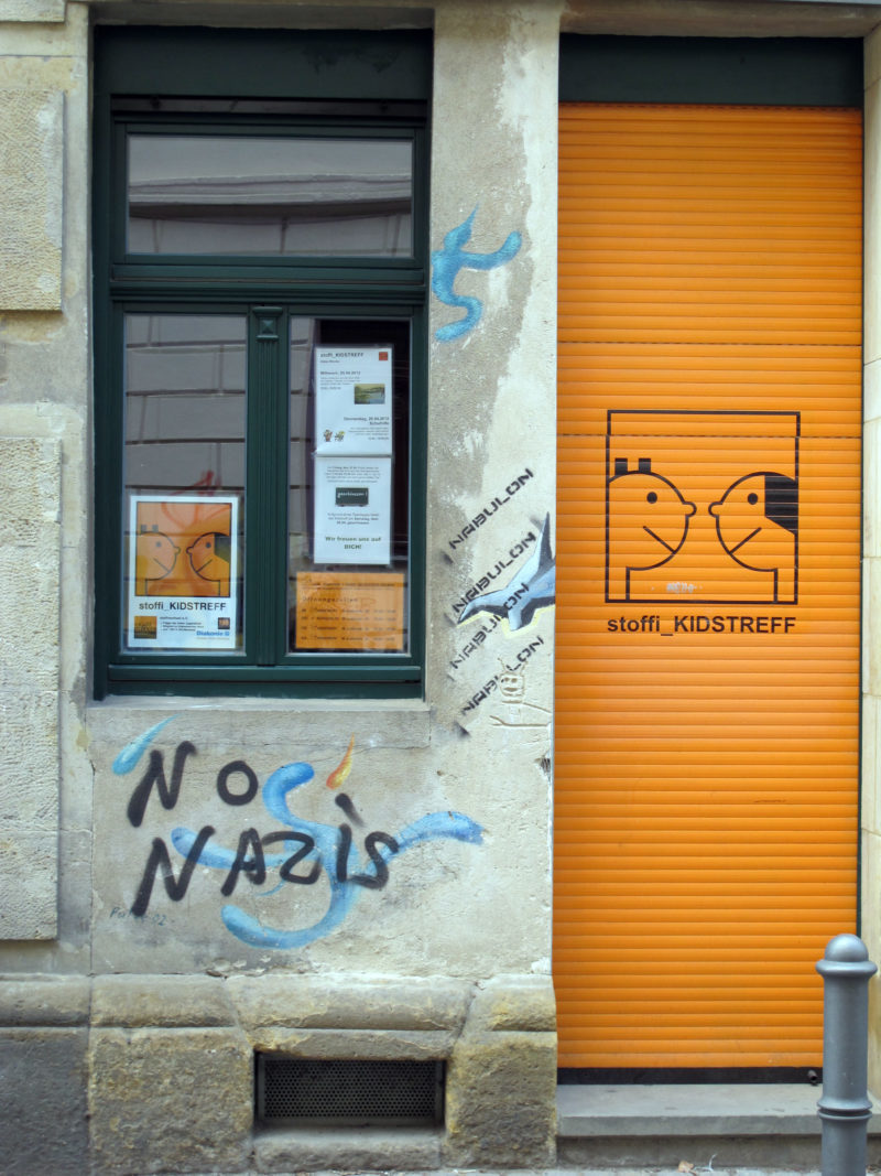 Here is a video that shows the people from #paintback, a group (Die Kulturellen Erben) loosely connected to a paint store for sprayers, at work – they reconfigure Nazi symbols into little artistic jokes and scenes that undermine the whole brown menace. They have now found many imitators in various European countries.