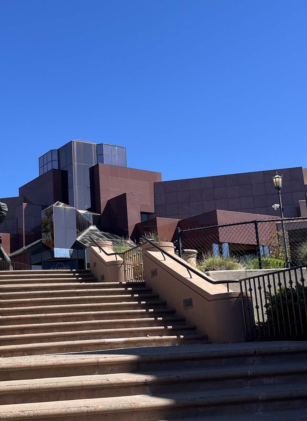 The museum is situated on top of a hill occupied by an originally posh strip mall, now in various stages of decay, stores closed down, fountains turned off, ponds dried out.
