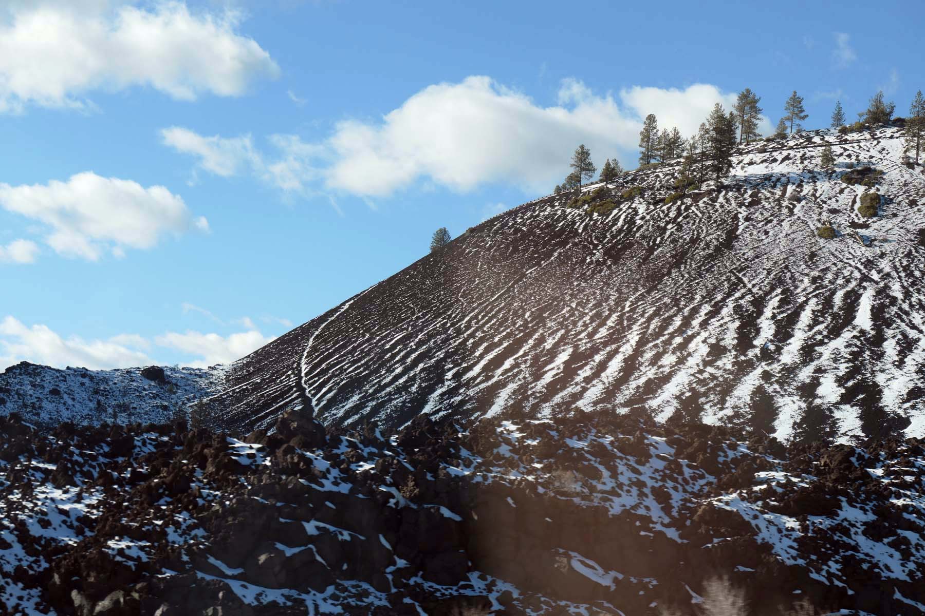 are the lava fields produced by one of the largest High Desert volcanoes, the Newberry Volcano. Three million years old, it covers more than 2,000 square miles and sent basalt flows down the canyon of the Deschutes River as far as 65 miles from the main crater (overall it just looks like a mountain chain rather than a dome.)