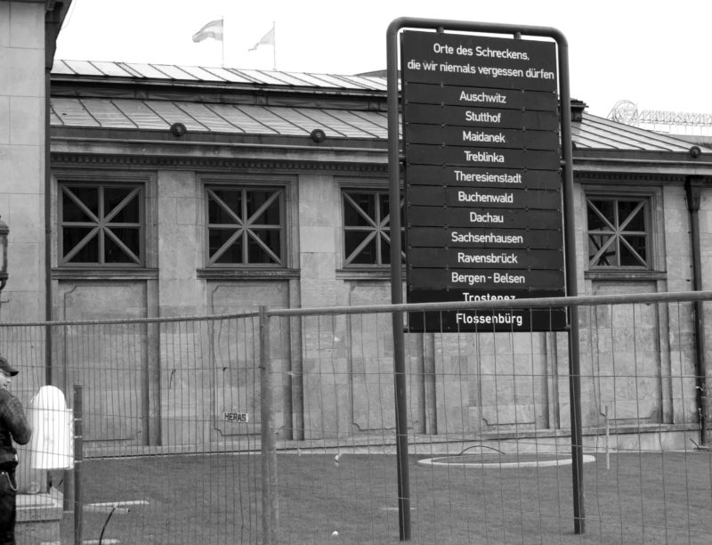 State-organized terror might not be on for us right now, but it did happen in history, as we know. And being reminded of it helps us to be forearmed, or so one hopes. Usually museums and memorials do that for us. We visit them, however, only on occasion. Perhaps it’s better to make reminders of the consequences of terror more visible in our every day life. In Berlin, for example, a project, Places of Remembrance, by Renata Stih and Frieder Schnock put signs on street lamp posts which depict images of daily scenes and profession on one side and display condensed versions of anti-Jewish Nazi regulations passed between 1933 and 1945 on the reverse side. They remind us of shared human experiences before people were divided into those allowed to live and those violently put to death. All in keeping with an ideology that “necessitated” pure blood lines. I wonder what the equivalent might look like in this country.