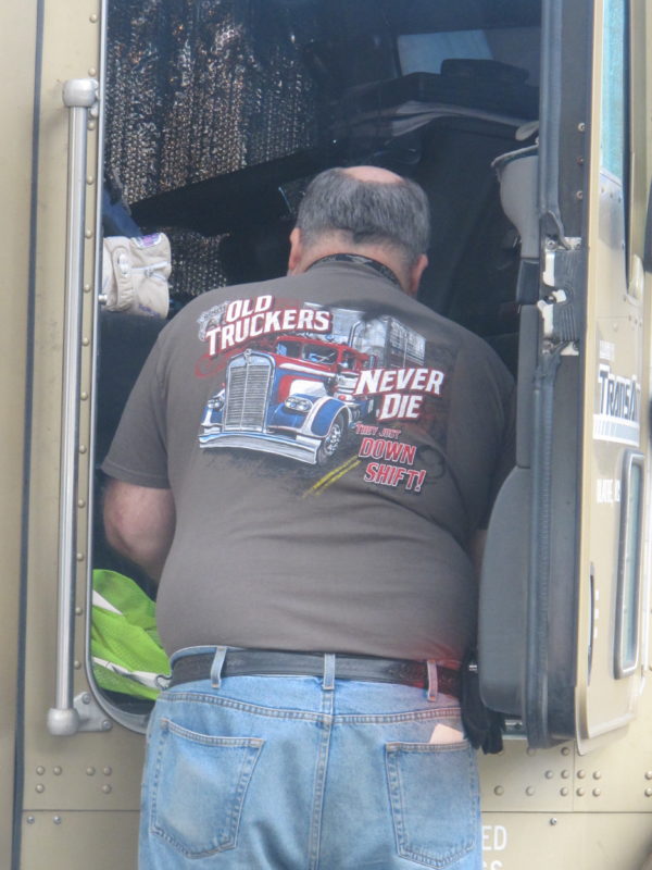 The trucker wearing this t-shirt actually came quite close to dying – almost being murdered by your’s truly after she spent a night in a non-air conditioned Texas motel room next to his idling truck, which he probably used as a nicely cooled B&B….the noise made it impossible to sleep.