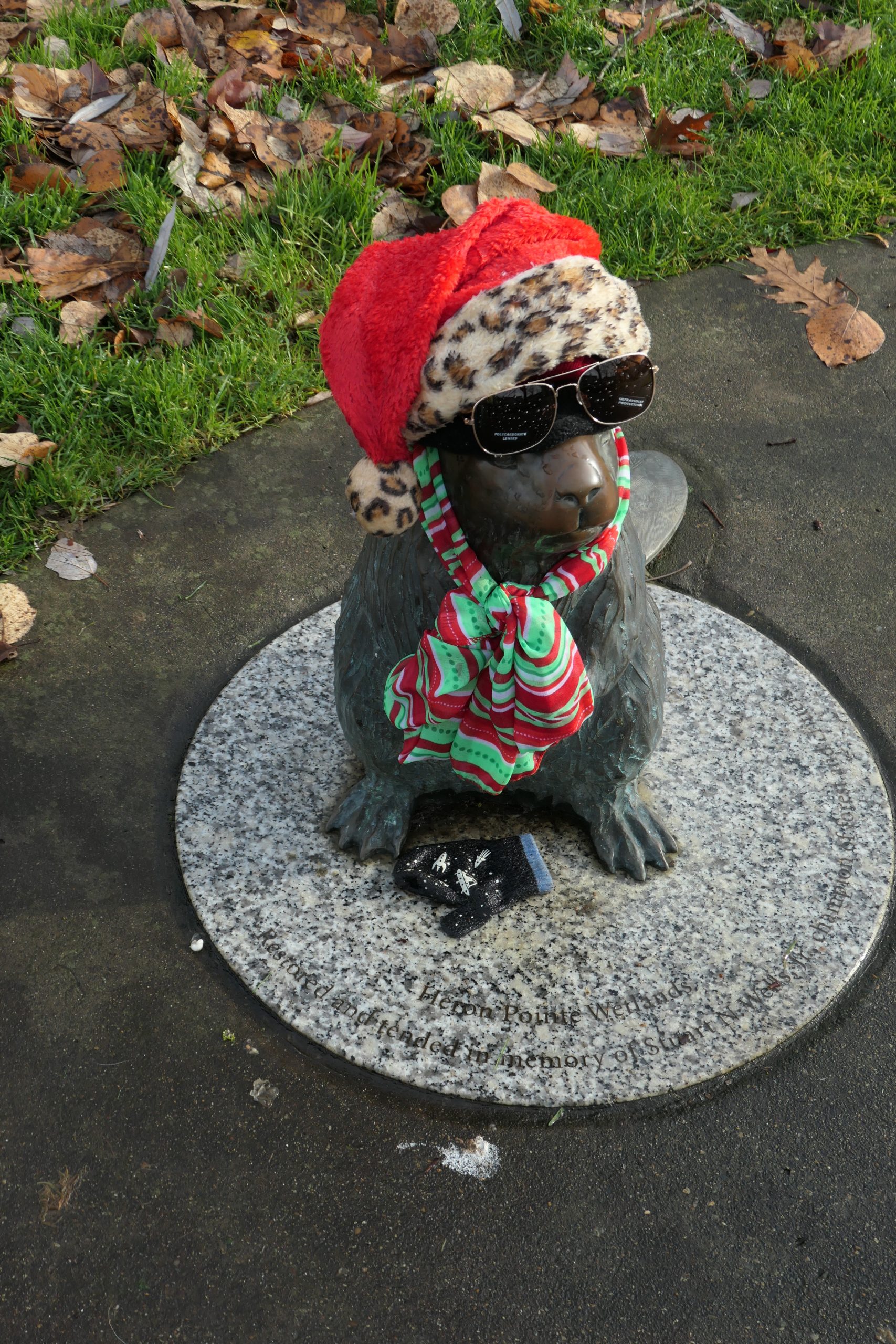 A defining feature is a small sculpture of a beaver. For the life of me I can’t remember if it was already there when the kids were little. My own inner child’s soul starts to radiate, whenever I pass by, because someone with a sense of delight puts it into seasonally appropriate costumes. Captious (marked by an often ill-natured inclination to stress faults and raise objections) people might object to disgracing art – I thrive on the fact that it makes me laugh.