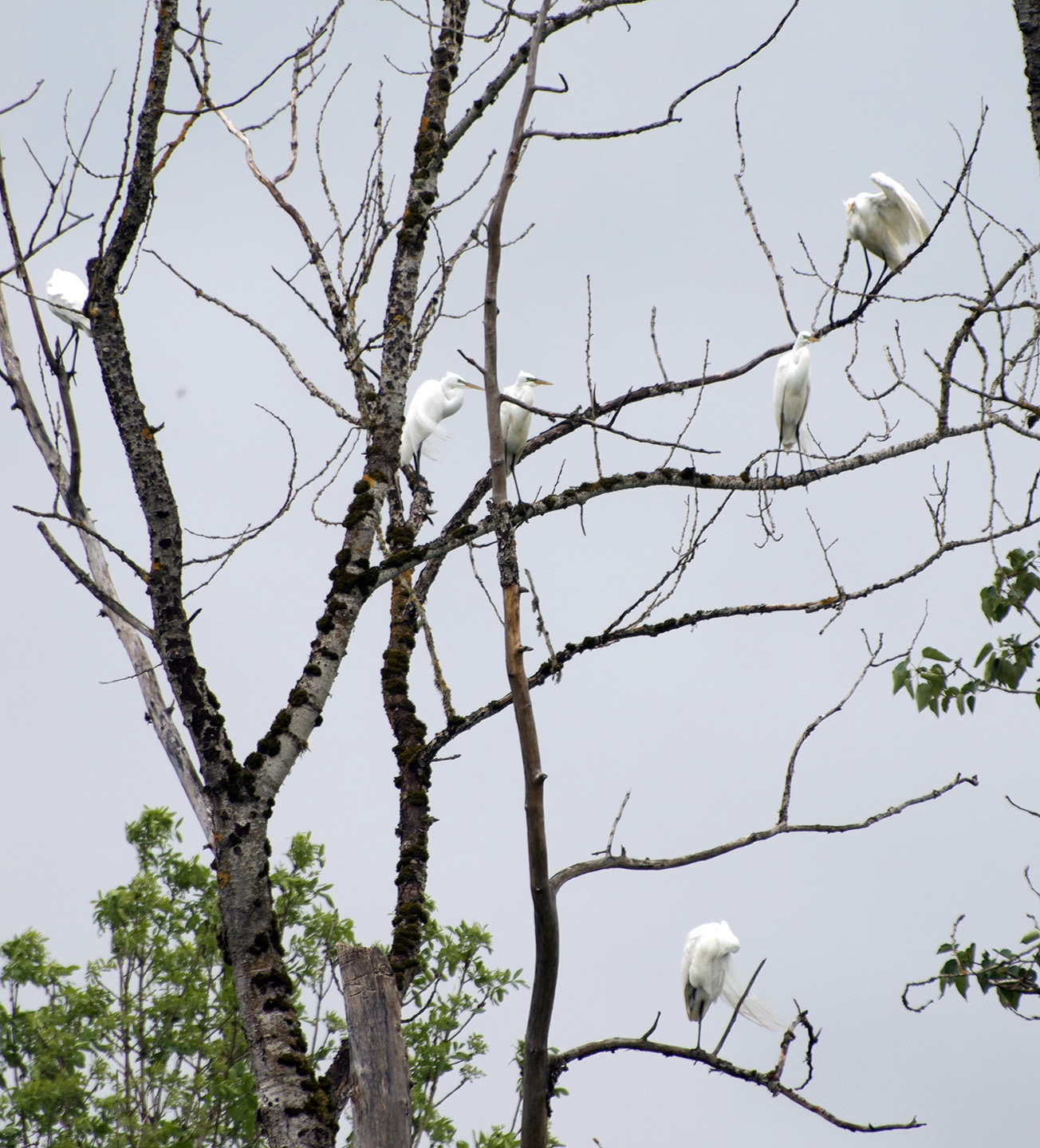 No longer. It has become so clear to me that what moves me most deeply is the sense of wonder when nature is willing to let you come close for experience, surprising you with unexpected encounters in your daily life. Here is a path that I have walked for over 30 years multiple times a month, and all of a sudden there is a tree, dead after this strange winter, that serves as seating for multiple great egrets. I have seen these kind of birds before, in various places, sometimes more than one in water and swamp lands, but never here, that high, that unperturbed. Documenting them from a distance with an amateur’s camera is a bonus, not the prize.
