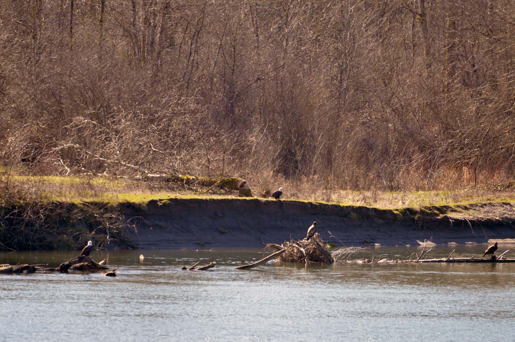 Many of them circling higher than I had ever seen them. I first thought those were vultures, joining the feast, but no, all eagles, many of them juvenile who still have brown feathers instead of the symbolic white heads and tail feathers. Lots of courtship acrobatics in the air, with males and females, mating for life, eventually tumbling down in pirouettes, gripping each other’s talons before landing for the fun to begin.