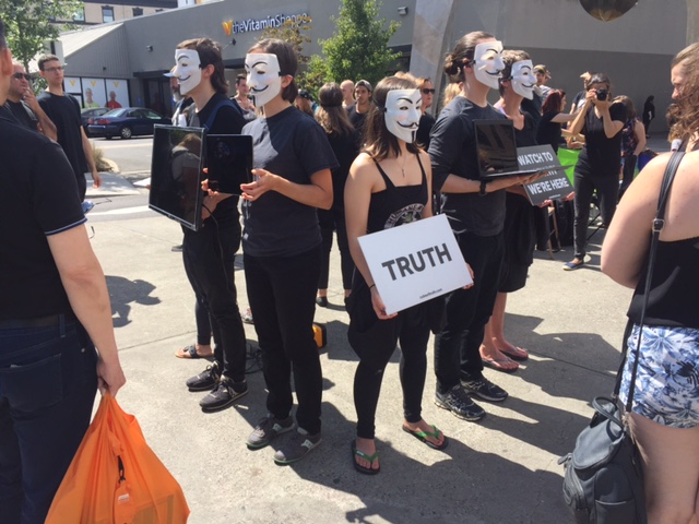Photographs are of members of a vegan organization /PDX chapter who were demonstrating and informing in front of Powell’s Bookstore today. They showed movies that they made under “threat to their lives” going undercover in the agricultural industry. That was repeatedly emphasized. Got lots of attention. And now let me think, guilt twinges and all, about Bratwurst for dinner.