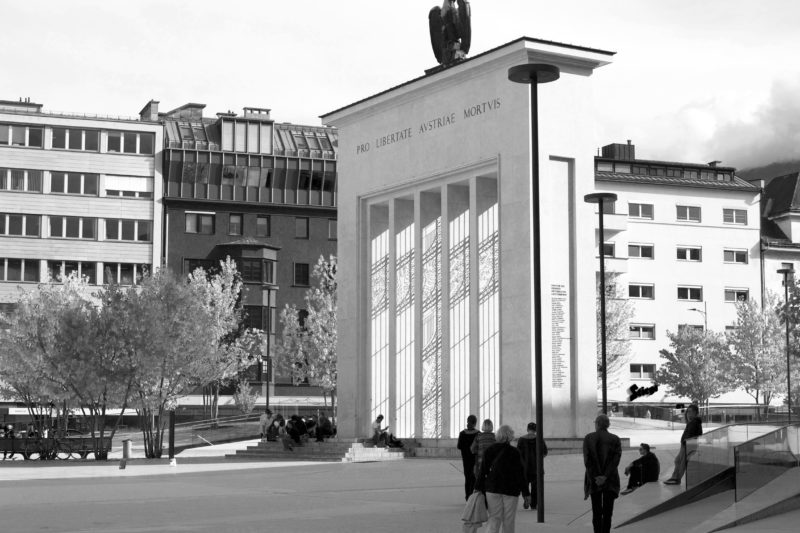 Close to the war memorial stands a much smaller memorial in shape of a Menorah for the victims of Kristallnacht, November 9 1938, initiated in 1997 (in a school contest!) The right-leaning Kronenzeitung came out with a complaint, predictably prefacing its concerns about money and questions about ulterior motives with “Nothing against memorials, but —.” The memorial features a menorah design, and a separate sign nearby with the details of the pogrom in Innsbruck. I unfortunately don’t have a photograph.