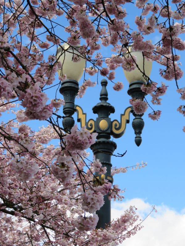 If you walk along Portland’s waterfront park right now the wind and rain will often make the air around you twirl with petals of cherry blossoms. The area around the Japanese American Plaza – commemorating the internment of the Japanese during WW II – is filled with blooming cherry trees that were imported from Japan, a gift of the Japanese Grain Importers Association, planted 28 years ago.