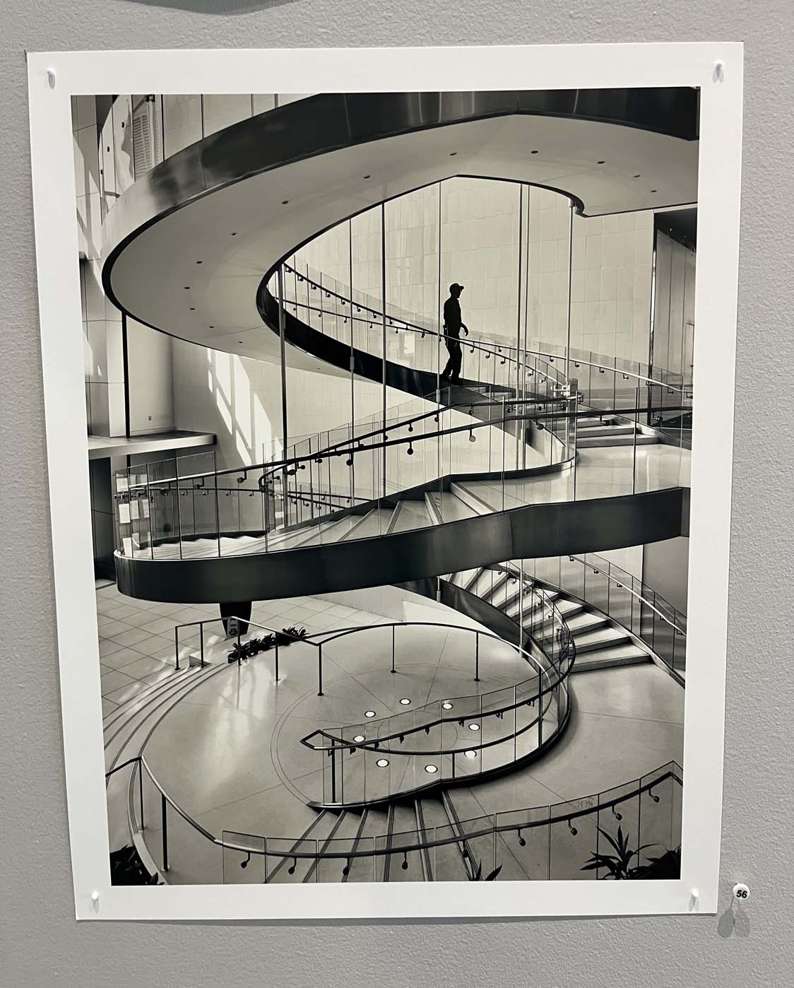Tomes have been written about the lure of ruins and abandoned or decaying industrial and commercial space for photographers. Lucky for us, Law does not yield to the temptation to accentuate morbid aspects of decline. Instead, he provides a portrait of a place that still occasionally vibrates, still has moments of beauty, still conveys a sense of the original optimism of builders trying to integrate structural elegance and airiness into dens of commerce. Add to that choice of positive depiction a clever way to display his photographic harvest: the images on the wall are sequenced in various fashions that echo the feelings of walking through a Mall. There is no unifying style, color and black&white happily co-reside, sizes are all over the map, prints refuse to be rigidly aligned. Some walls are dedicated to architectural themes, others hint at subjective moments that roused emotions in the photographer. Busy views are counterbalanced by quiet glimpses. Law’s capture of the space mirrors both aspects that were emphasized by the original designs (as well as the plans for redevelopment), namely activation AND lingering.
