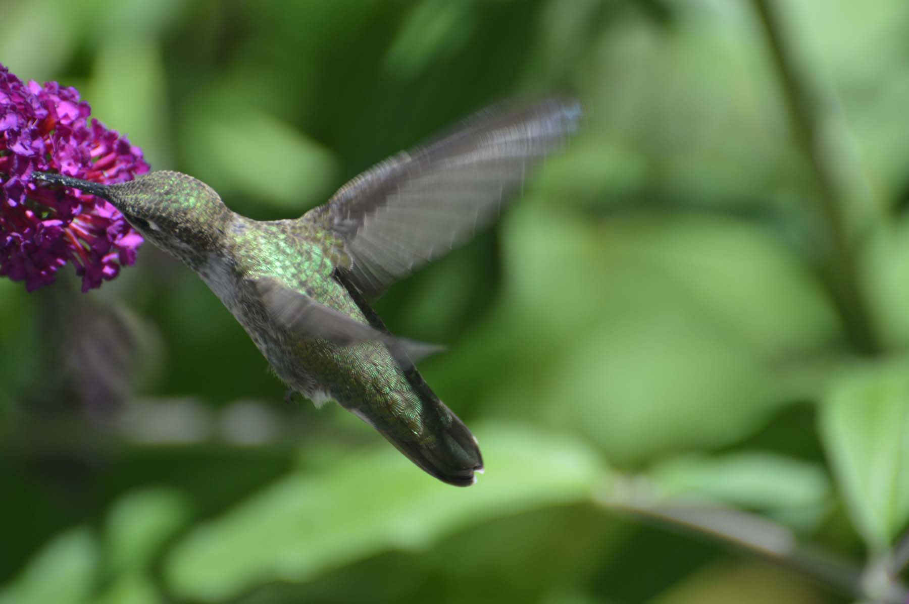Now in my own garden, I have hummingbirds come to the butterfly bush, or the salvias, like most years. It requires patience to catch a glimpse of them, sitting quietly near the plants, hoping they make an appearance. And then there they are, fluttering, flitting, an occasional short rest break, and as suddenly gone as they appeared.